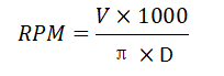 Spindle speed (RPM) is calculated from the cutting speed formula.